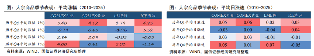 大宗商品整体在一季度呈现"胜率较高、收益偏正"的季节模式。黄金一季度平均涨幅约4%,白银、铜、布油在春季躁动期间也表现较强。这种共振效应主要由分母端驱动,与央行释放宽松信号强弱基本正相关。