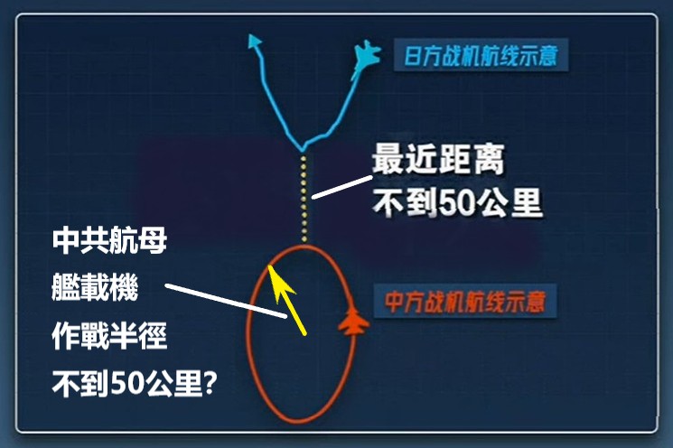 12月6日,辽宁号舰载机歼-15故意照射日本F-15战斗机,央视泄露了真相。日本F-15战斗机距离中共的演训区约50公里,歼-15的飞行员可能就紧张至极。按照中共绘制的航迹图,如果比例正确,歼-15基本在以航母为圆心大约半径50公里的范围绕行,防卫能力相当有限,应该算另一大尴尬。