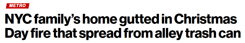 一位邻近房屋的业主向《纽约邮报》表示,自家房屋仅轻微受损,纯属侥幸。他说:“这全看风往哪边吹。我真的很同情那户人家——在圣诞节发生这种事,简直令人难以置信。”