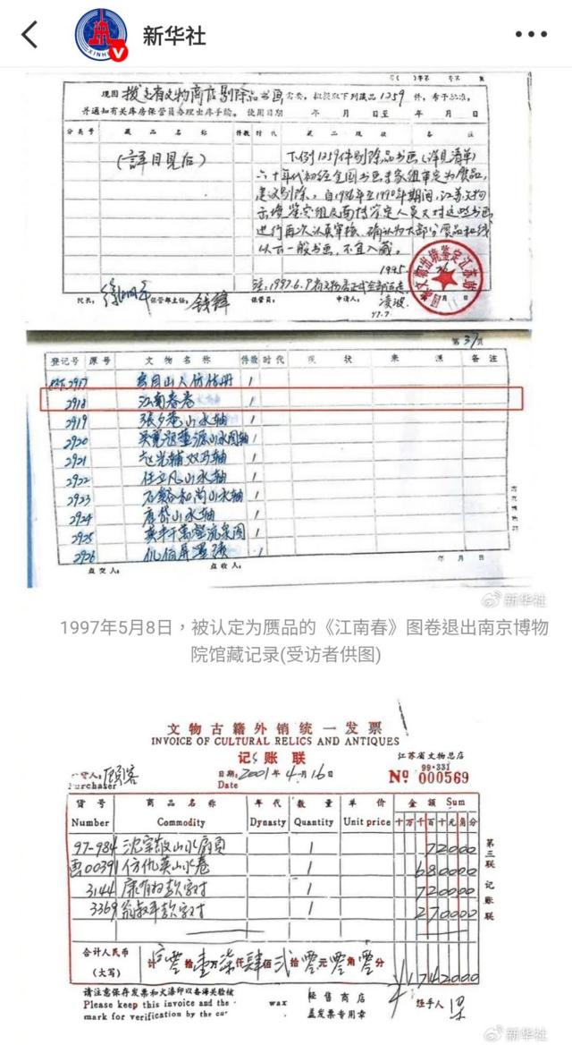 新华社19日发表有关古画流落民间事件的“追踪”报道,称南博馆方出示了两份鉴定纪录,以及《江南春》图卷被评定为赝品后,被馆方“划拨、调剂”的纪录,显示原江苏省文化厅于1997年4月21日同意调剂,同年5月8日,图卷拨交给原江苏省文物总店,至2001年4月16日被“顾客”以6800元价格购走,销售清单上的品名为“仿仇英山水卷”。