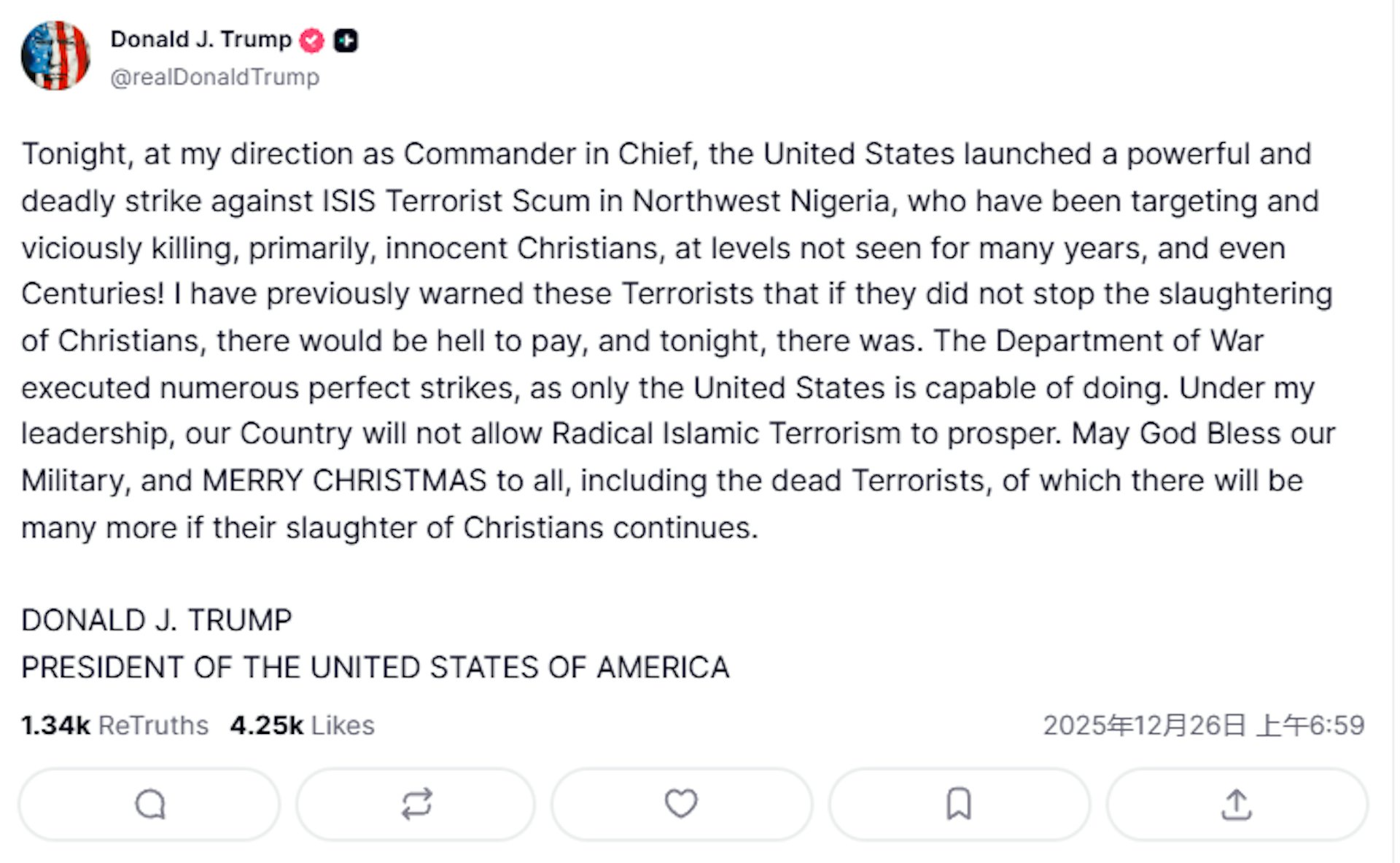 2025年12月25日,图为川普在旗下社交平台发文称自己已下令美军袭击尼日利亚西北部的极端组织ISIS。(截图自TruthSocial@realDonaldTrump)