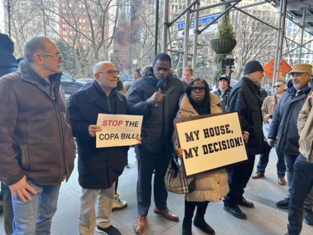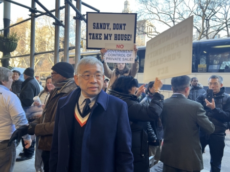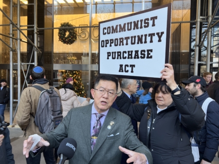 12月18日,在纽约市议会召开年度最后一次全体会议前,纽约州华裔共和党参议员陈学理和州众议员郑永嘉站在百老汇大街250号议会大楼前,带领纽约市的业主们抗议即将被投票的一个提案——《社区购屋机会法案》(COPA)。