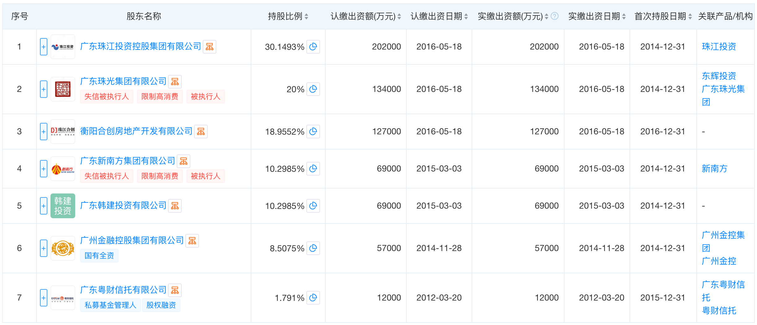 目前该公司已经有三位股东质押了共27.67亿股股权,占总股权比重高达41.3%;其中,质押了全部股权的广东珠光集团、广东新南方集团都已成为失信被执行人。