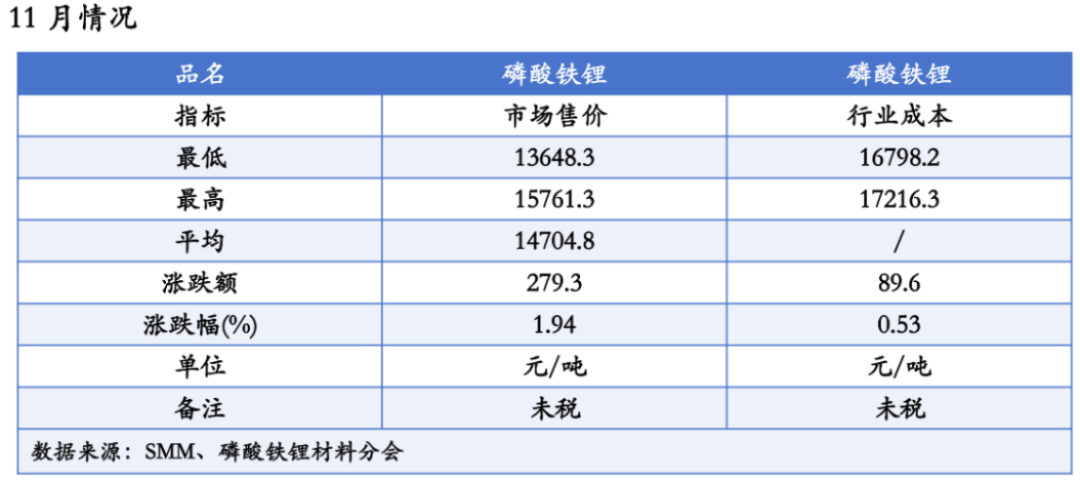 据中国化学与物理电源行业协会数据,11月磷酸铁锂市场售价平均为14704.8元/吨,行业成本则在16798.2元/吨至17216.3元/吨区间。