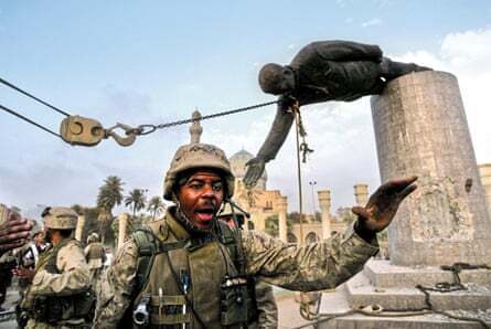 2003年4月9日,美军进入巴格达,萨达姆·侯赛因的雕像被推倒的画面成为这场战争的标志性图像之一。五角大楼将其宣传为伊拉克人民欢庆推翻他们憎恨的独裁者的象征。
