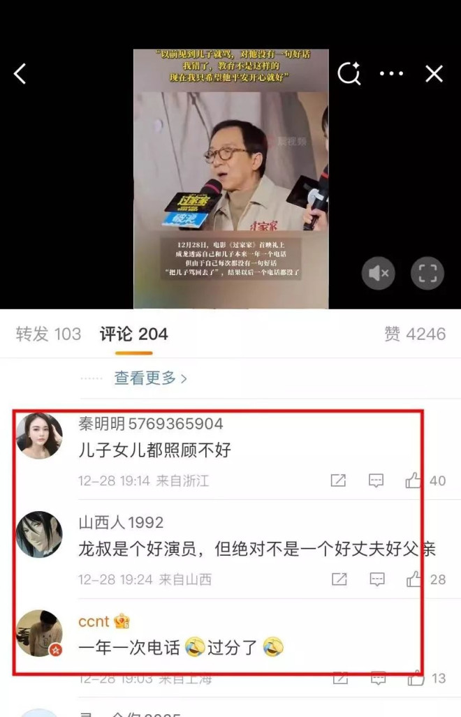 网友虽然不了解成龙的家庭情况,但评论还是一针见血,认为成龙儿子女儿都照顾不好,还有人认为他是好演员,但绝对不是一个好丈夫好父亲,更有人认为一年一次电话过分了。