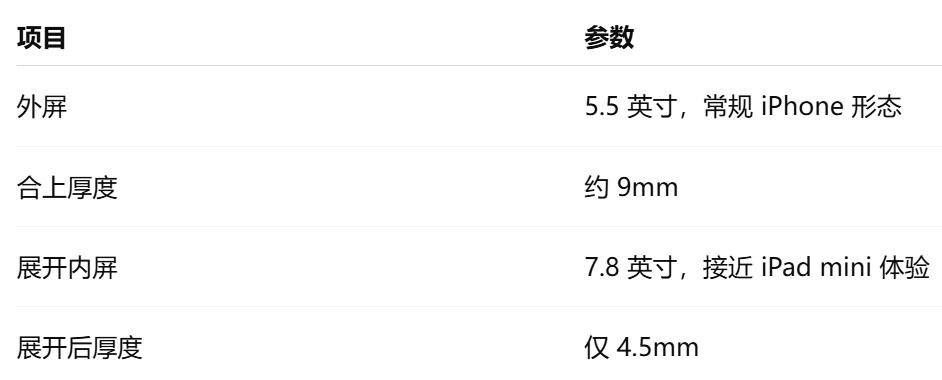 要知道,“迄今为止最薄的 iPhone” iPhone Air 的厚度为 5.6mm,已经薄到“几乎只剩一个 USB-C 口”,如果 Jon Prosser 的说法属实,展开后的 iPhone Fold 单侧比 iPhone Air 还薄了整整 1 毫米以上,几乎到了工程极限。