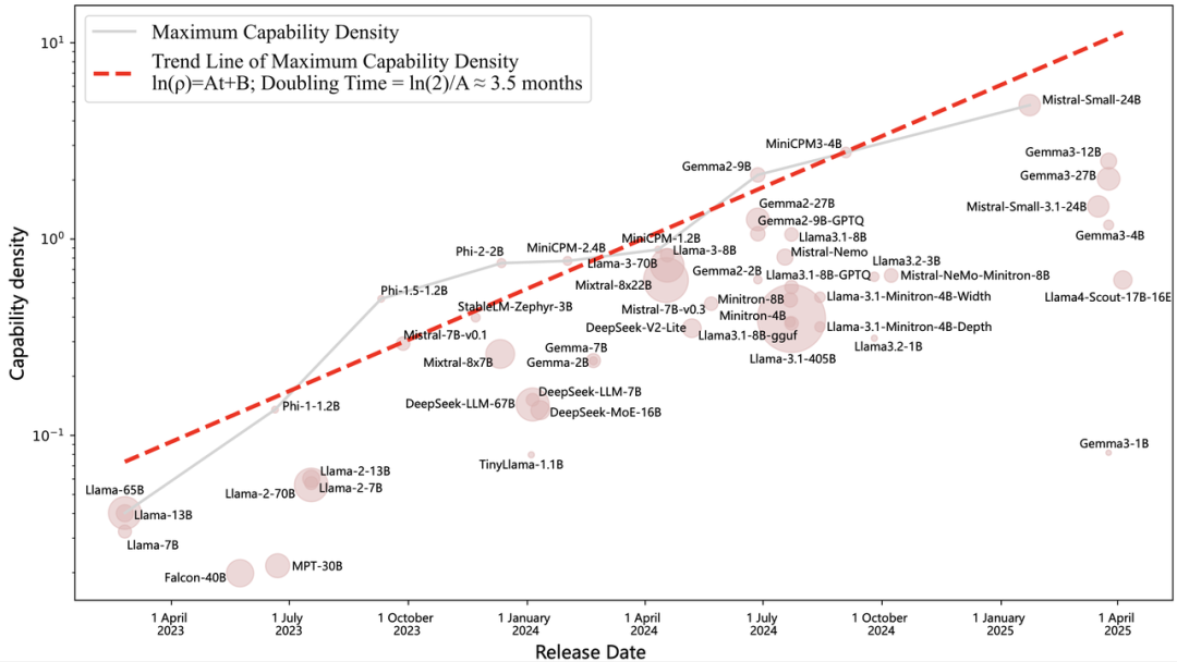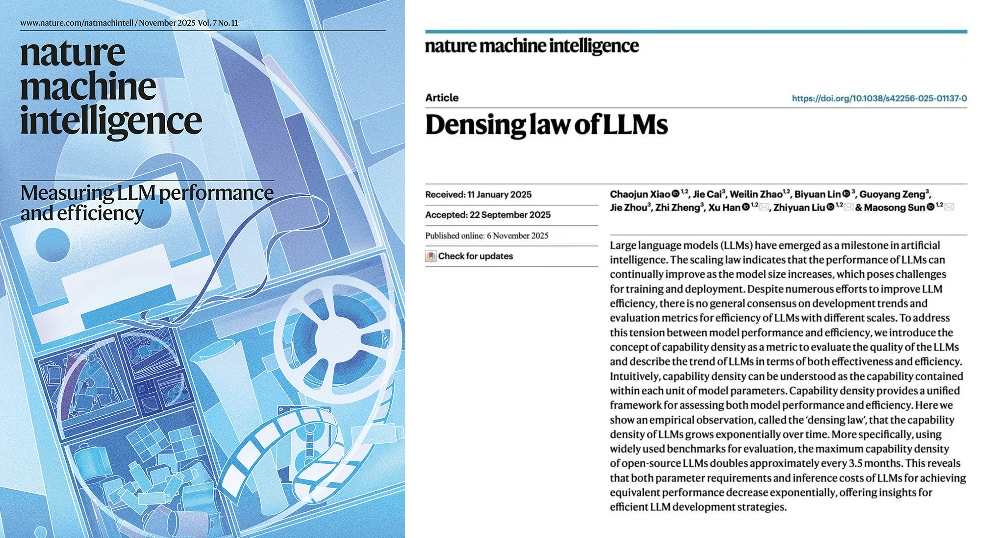 2025年11月,刘知远团队的研究登上全球顶级学术期刊《自然·机器智能》(Nature Machine Intelligence)封面,正式提出大模型的“密度法则”(Densing Law)。