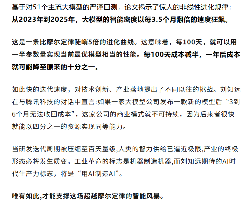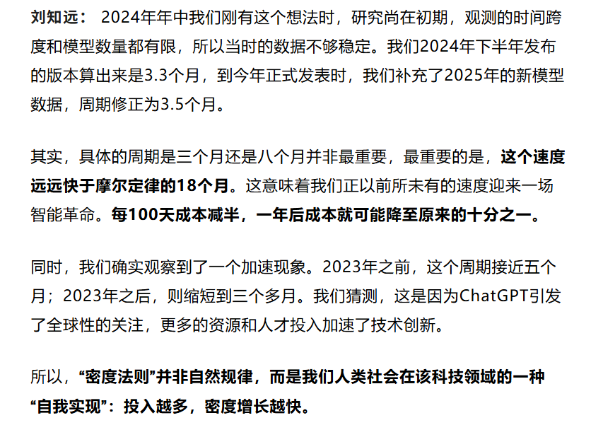 腾讯科技:您在2024年WAIC期间曾提到模型的“密度法则”周期是8个月,但最终论文的结果是3.5个月。为什么进化的速度比您预期的快这么多?