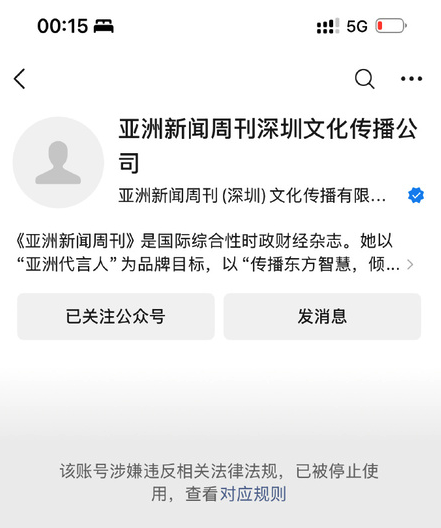 12月30日,拥有20.7万粉丝《亚洲周刊》微博账号的名称变成一串数字,所有微博内容被清空,账号页面显示,“因违反相关法律法规,该用户目前处于禁言状态”,微博搜索入口找不到该账号。