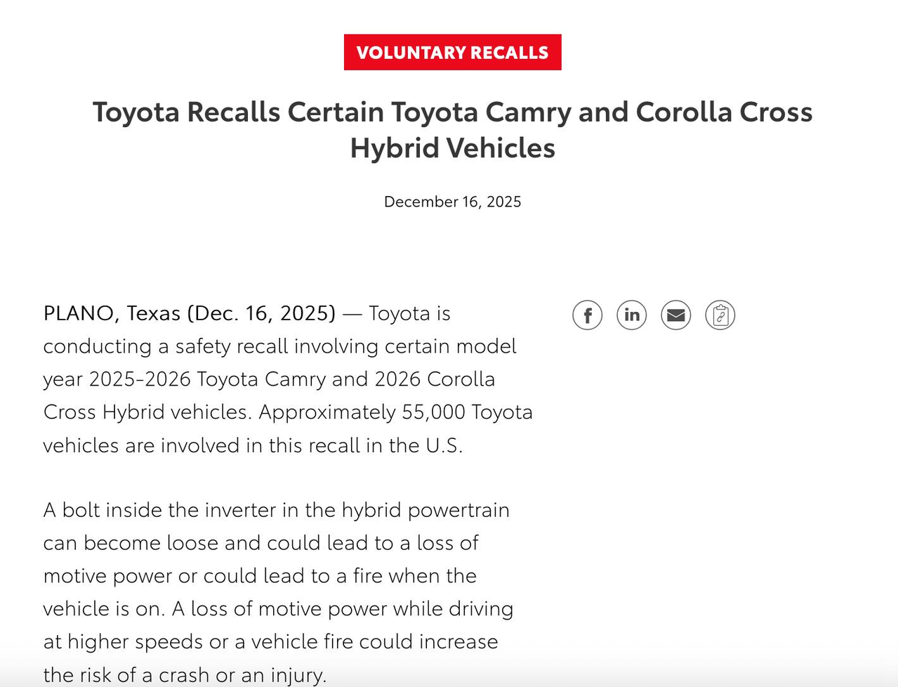 这次召回的车种,涵盖部分2025-2026款Camry Hybrid与2026款Corolla Cross Hybrid混合动力车。NHTSA在报告中指出,车辆在高速行驶时失去动力会增加碰撞风险,若螺栓接触不良,逆变器组件内变得松动,但点火系统仍处于开启状态时,可能造成短路,增加起火风险。