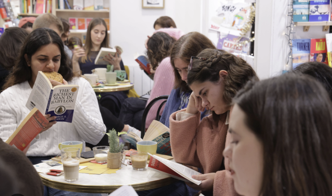 人们低头阅读、轻声翻页。有人在日记本上写字,有人画画。