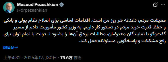 “人民的生计是我每天最关心的事情,”佩泽希齐扬30日在X平台发文称,“我们已将改革货币和银行体系、维护人民购买力的根本性措施提上日程,我已指示内政部长与抗议者代表进行对话,听取他们的合理诉求,以便政府能够负责任地、全力以赴地解决问题。”