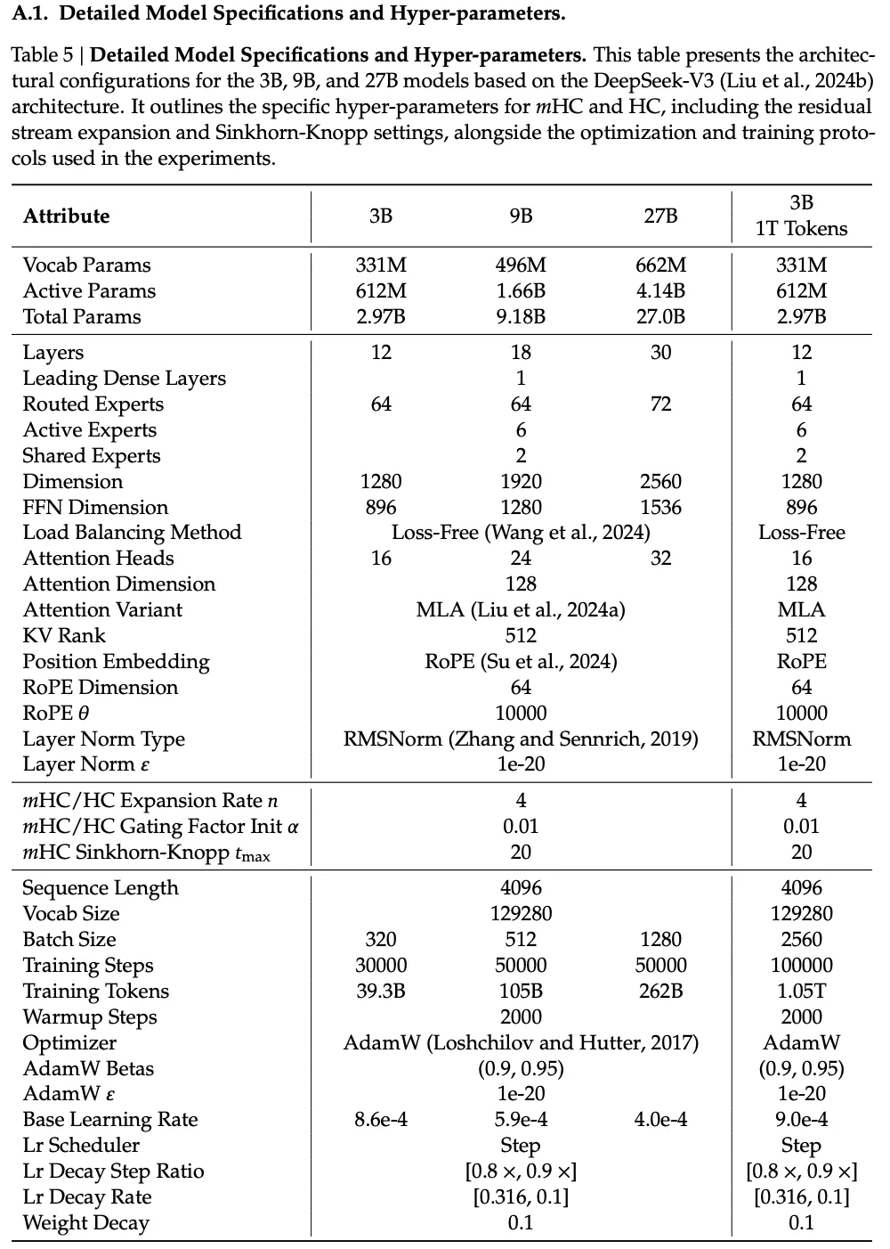 具体而言,HC 和 mHC 的扩展率 n 均设置为 4,主要关注点是一个 27B 参数规模的模型。其训练数据集的大小与其参数量成正比,该模型用于展示系统层面的主要结果。在此基础上,他们通过引入使用成比例数据训练的较小的 3B 和 9B 模型来分析计算扩展性,从而观察不同计算规模下的性能趋势。此外,为了专门研究 Token 规模的影响,他们另外训练了一个独立的 3B 模型,该模型在一个固定的 1T Token 的语料库上进行训练。