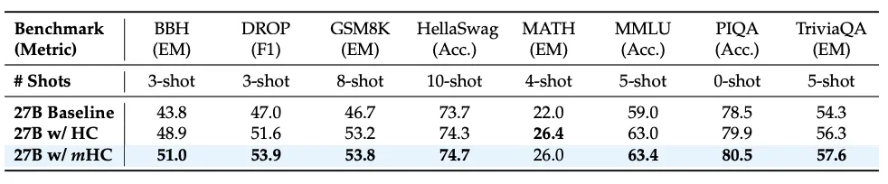 表 4:27B 模型在系统级基准测试上的结果。 本表对比了基线模型、HC 以及 mHC 在 8 个不同的下游基准测试中的零样本和少样本性能表现。结果显示,mHC 始终优于基线模型,并在大多数基准测试中超越了 HC,证明了其在大规模预训练中的有效性。