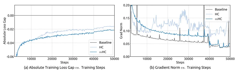 图 5:流形约束超连接 (mHC) 的训练稳定性。 该图展示了:(a) mHC 和 HC 相对于基线模型的训练损失绝对差值;(b) 三种方法在训练过程中的梯度范数。所有实验均基于 27B 参数规模的模型。实验结果表明,mHC 在损失函数和梯度范数两方面均表现出更优的稳定性。