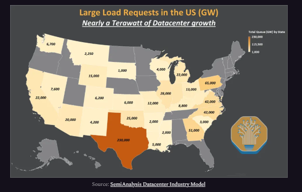 下图说明了问题:仅在德克萨斯州,每月就有数十吉瓦的数据中心负载请求涌入。然而在过去12个月里,仅批准了略高于1吉瓦的容量。电网已经售罄。
