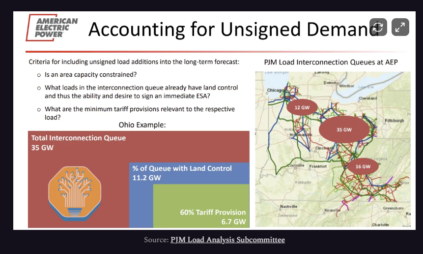 FERC第2023号命令已推动电网运营商为此采用集群研究,但这些改革直到2025年才巩固下来。实际上,"淘金热"行为意味着开发商同时向不同的公用事业公司提交多个投机性请求。例如,截至2024年中,AEP俄亥俄州有35吉瓦的负载请求——其中68%甚至没有土地使用权。投机性请求堵塞了所有人的队列,从而鼓励了其他地方更多的投机性请求。这种恶性循环加速了。
