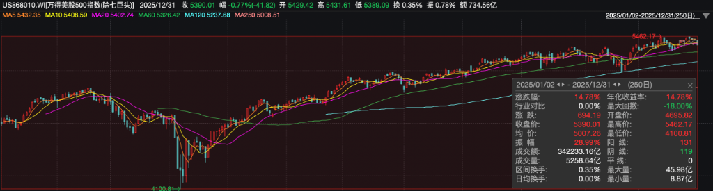 值得注意的是,这种高度集中的市场结构正积累显著风险。当前,以“七巨头”为代表的头部企业市值已占据标普500指数总市值近40%的历史高位。数据显示,2025年剔除七大科技巨头的万得美股500指数涨幅为14.78%,明显落后于包含巨头的标普500指数16.39%的整体表现。