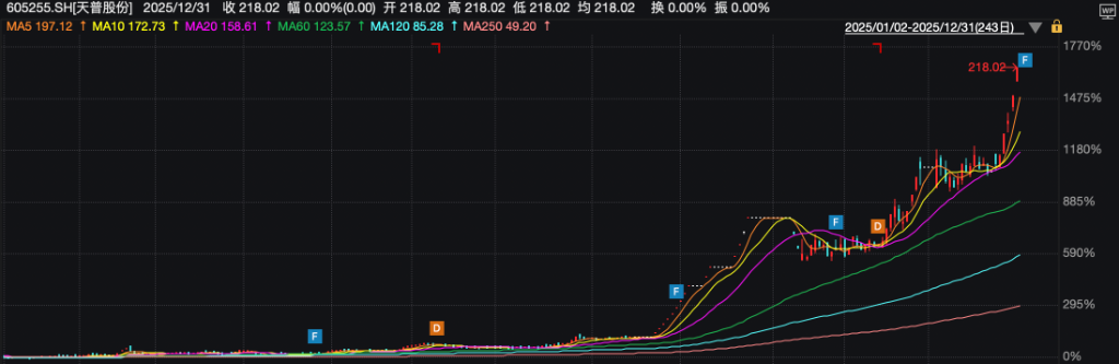 主营汽车零部件的天普股份,2025年股价实现16倍暴涨,从10元涨到218元的高位,核心是AI芯片借壳预期与TPU题材的双重发酵,引发资本合力追捧。