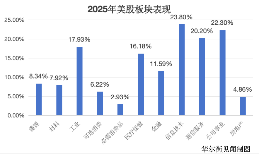 2025年,美股市场呈现鲜明的结构性分化,由人工智能资本开支驱动的信息技术和通信服务板块领跑市场,两者共同构成了贯穿全年的科技主线。值得注意的是,公用事业板块异军突起,反映出市场在利率预期与经济不确定性交织环境下,对稳定现金流资产的重估,以及对绿色能源转型基础设施投资的长期押注。