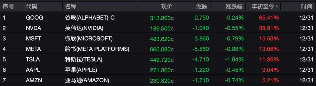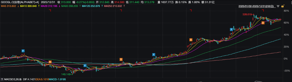 2025年,“科技七巨头”走势出现显著分化。除谷歌(累涨约66%)与英伟达(累涨约39%)以显著优势跑赢大盘外,微软、Meta、特斯拉等其他五家巨头涨幅均在11%至15%之间,均未能超越标普500指数年度涨幅。