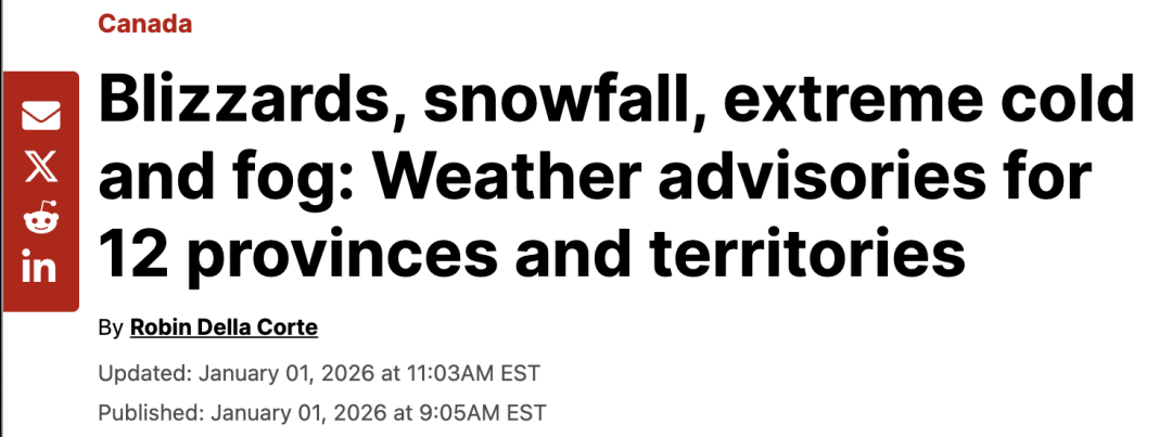 加拿大环境部(Environment Canada)在元旦当天向几乎所有省份和地区发布天气预警,根据官方通报,全国多地将遭遇暴风雪、强降雪、极寒、大风以及浓雾等多重极端天气。