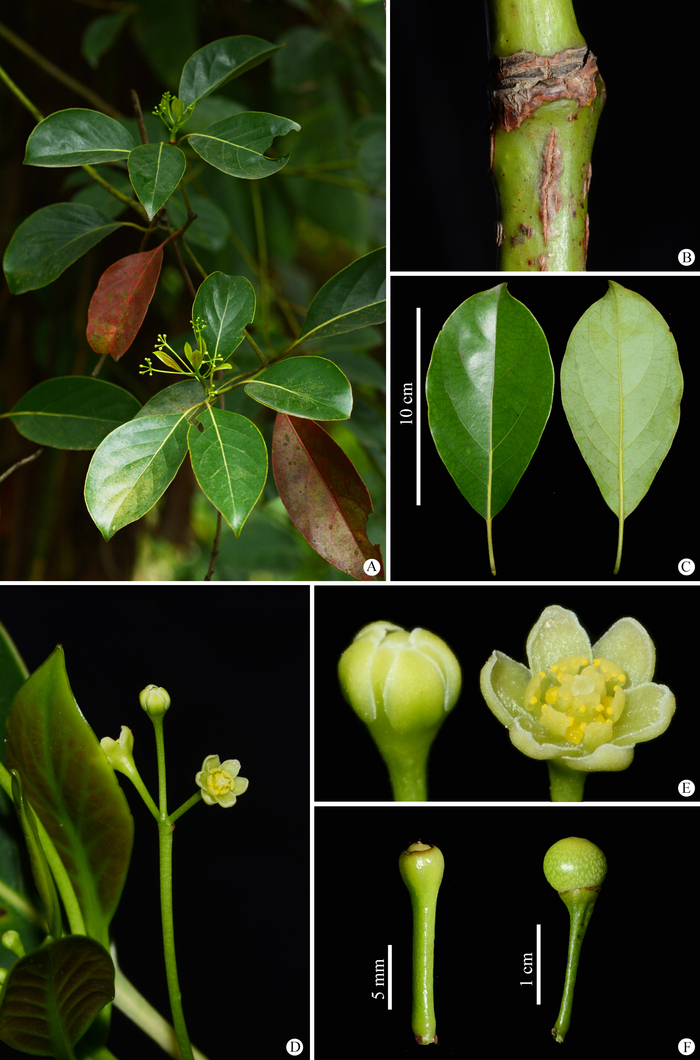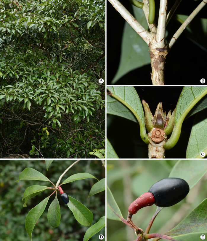 该主模式标本为一个带有幼果的枝条,其花被和雄蕊均已脱落。在原始描述中,Kostermans指出,该标本叶片具有明显的网脉,花梗向顶端逐渐膨大至与花被筒等宽。莲桂属植物的一个典型特征是花梗顶端膨大,且在果期发育为肉质肿胀的倒锥形,这或许正是Kostermans将这份标本归为莲桂属新物种的依据。