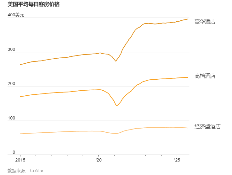 而更高的酒店房价并未削弱消费需求,数据显示,截至今年9月,美国豪华酒店预订量增长了2.5%,相比之下,同期对低端和中档酒店需求却低于去年。