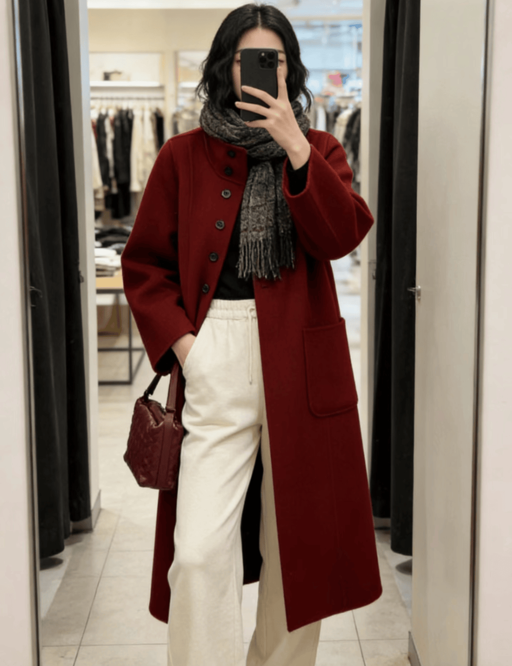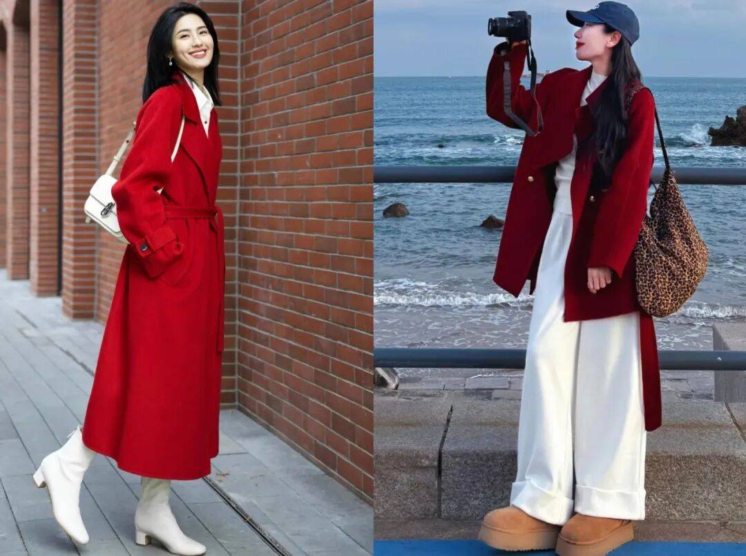 就像上图这样,长款的红大衣,版型宽松不挑身材,内搭简单的打底衫,下半身配一条白色的阔腿裤。