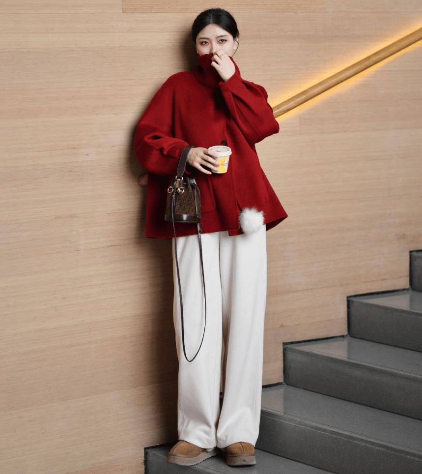 也可以换成短款的红色大衣,用来搭配一条垂坠感很好的白色阔腿卫裤。