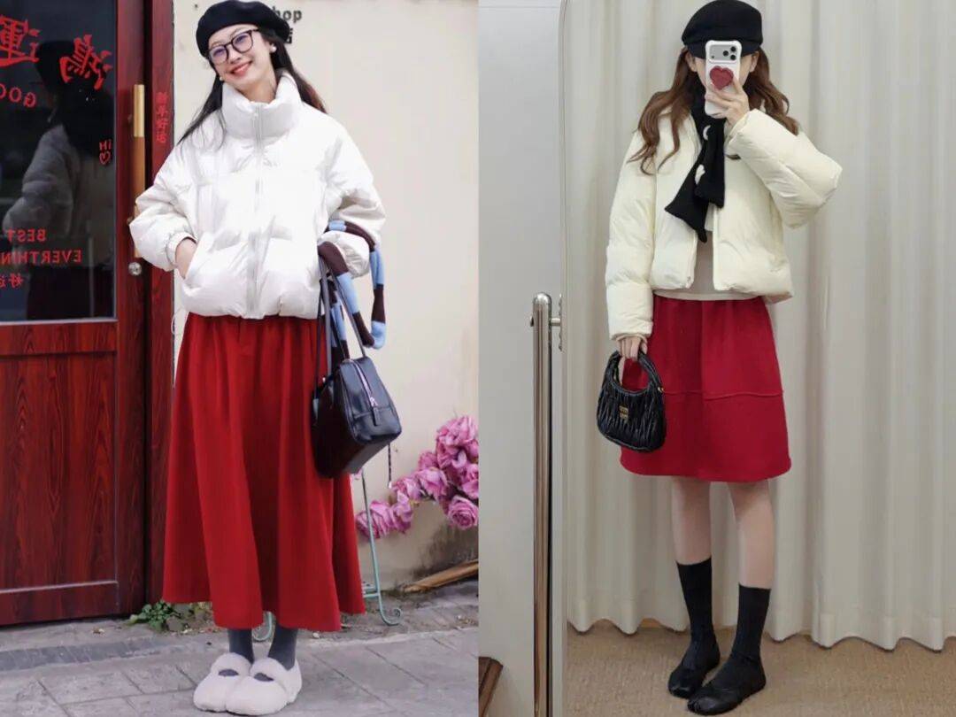 白色羽绒服的干净和红色A字裙的亮眼结合在一起,既保暖又时髦。