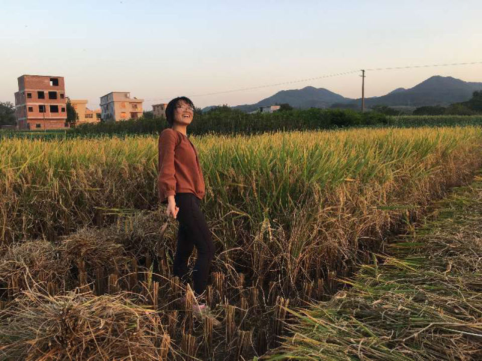 缪睫在山下钟敏父母家附近的田里割稻子 图/受访者提供