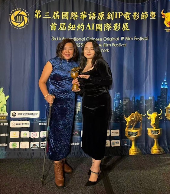 张慈(原创IP作者,左)和周千琦(艺术工程师,右)在纽约AI原创IP电影节上捧回“最佳IP改编奖”。(张慈提供)