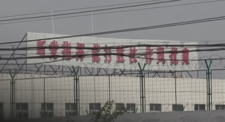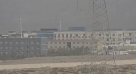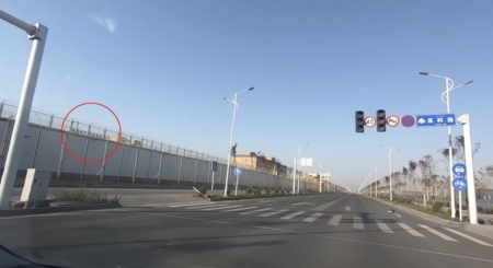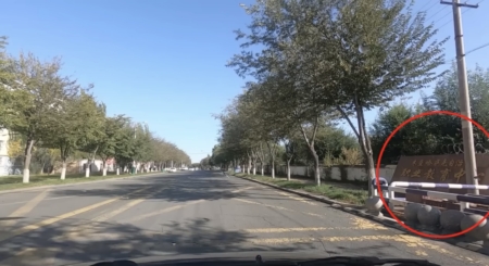 在乌鲁木齐市高科路,他拍到大型封闭设施,长焦镜头中清晰可见建筑顶部的标语:“劳动改造”“文化改造”。
