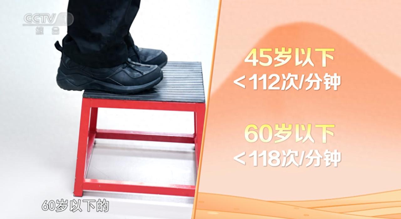 45岁以下:心率低于112次/分钟为合格;60岁以下:心率低于118次/分钟为合格;60岁以上:建议采用平路步行测试,以不心慌、能与人交谈为宜。注意:
