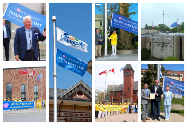 在加拿大,10个城市升旗,庆贺世界法轮大法日。