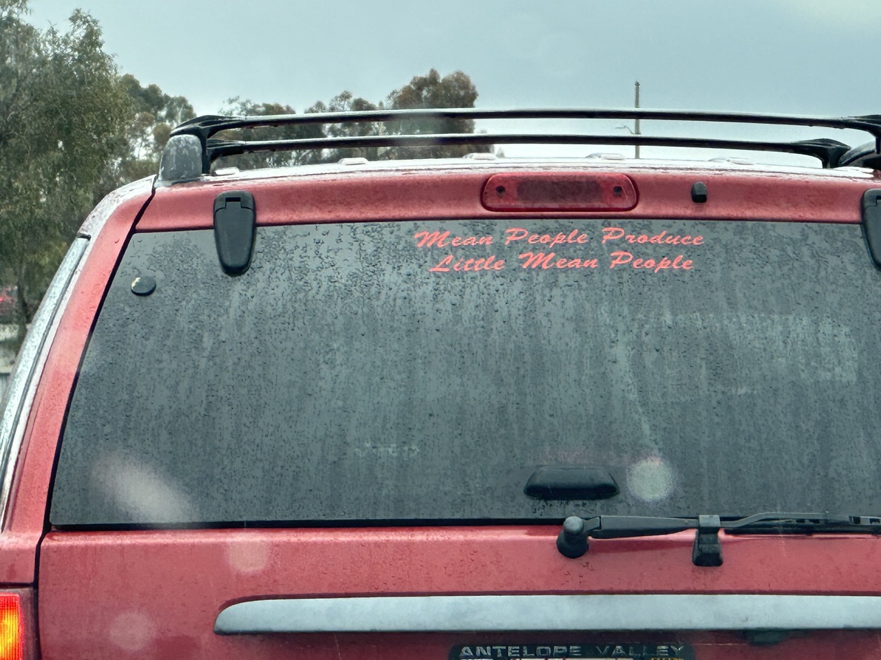 也有一些人会在车上贴上文字表达态度,比如“刻薄的人会养出小小刻薄的人”(Mean people produces little mean people)。(记者张宏╱摄影)