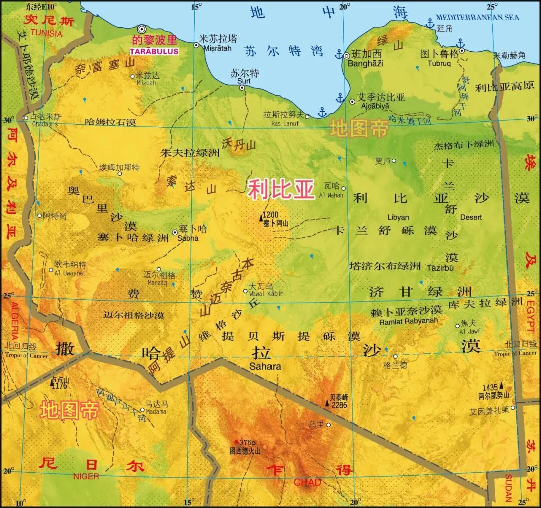利比亚位于非洲北部,地处地中海南岸,海岸线长1900余千米,面积约176万平方千米,居世界第十六位。