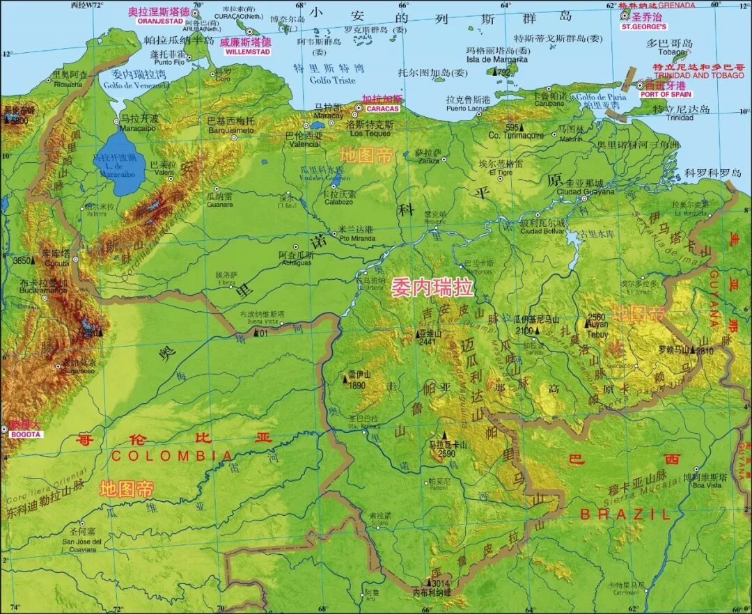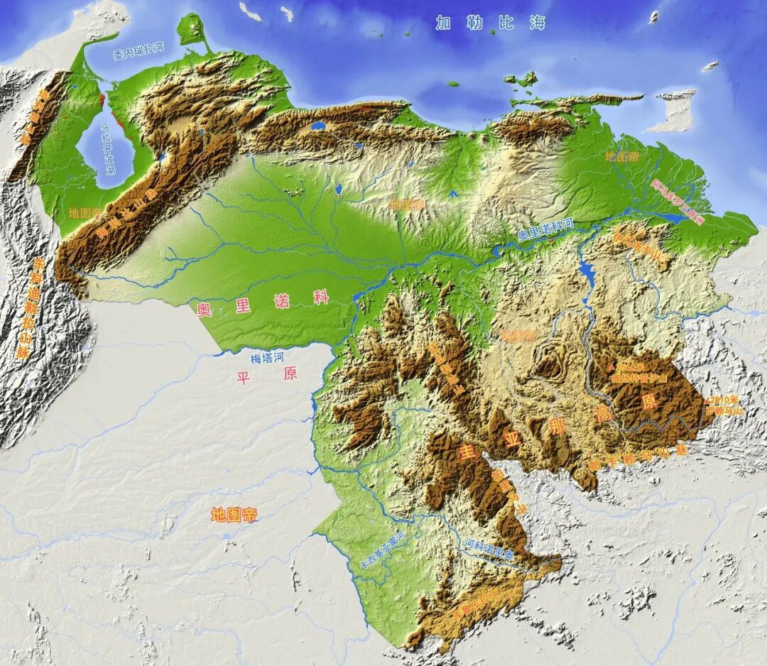 委内瑞拉地貌分为四大板块,西部是安第斯山脉梅里达山与佩里哈山围成的马拉开波湖平原,中部是奥里诺科河中下游的奥里诺科平原,东部是圭亚那高原,北部是沿海山脉,最高峰为安第斯山脉梅里达山的玻利瓦尔峰,海拔5007米。