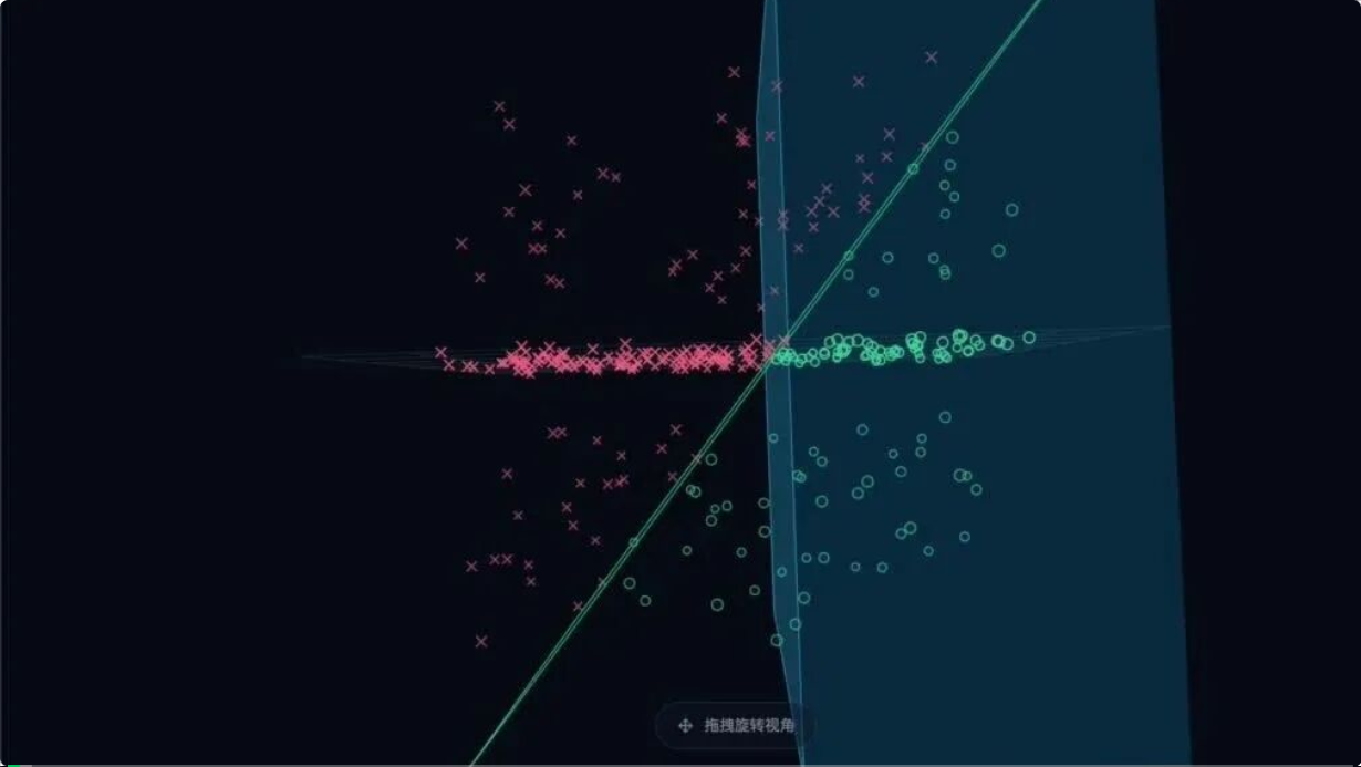 这个交互示例展示“可观性塌缩”的直觉:训练点只覆盖 XY 平面时,从正上方看模型分割几乎全对;但绕 X 轴旋转展开隐藏维度 Z 后,会发现蓝色区域只是贴着训练平面的一片“薄壳”,并未覆盖更完整分布。说明数据若未覆盖关键隐变量(摩擦/间隙/载荷等),模型往往只是对分布内投影过拟合,分布外就系统性失效。