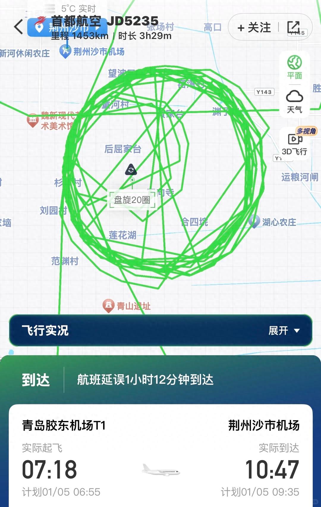 据了解,事发航班为1月5日青岛飞南宁的JD5235航班。飞常准平台显示,该航班在湖北荆州上空开始盘旋,开启“绕毛线”模式。