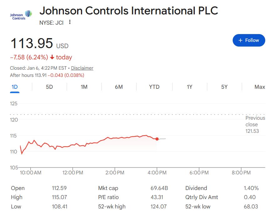 数据中心冷却系统制造商股价则遭遇重挫。江森自控(Johnson Controls)股价周二一度跌11%,收跌逾6.2%。Modine Manufacturing盘中曾跌21%,后收窄过半跌幅,收跌近7.5%,Trane Technologies和Carrier Global分别收跌2.5%和0.5%。