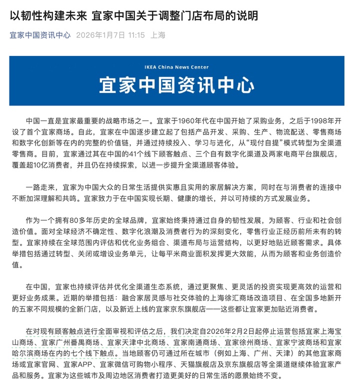 在经历了整整24小时社交媒体发酵与客服口径的反复拉锯后,宜家中国(IKEA)于当日正式发布《关于调整门店布局的说明》。这份公告确认,自2026年2月2日起,将停止运营包括哈尔滨、天津中北、上海宝山、广州番禺、南通、徐州及宁波在内的7家线下商场。