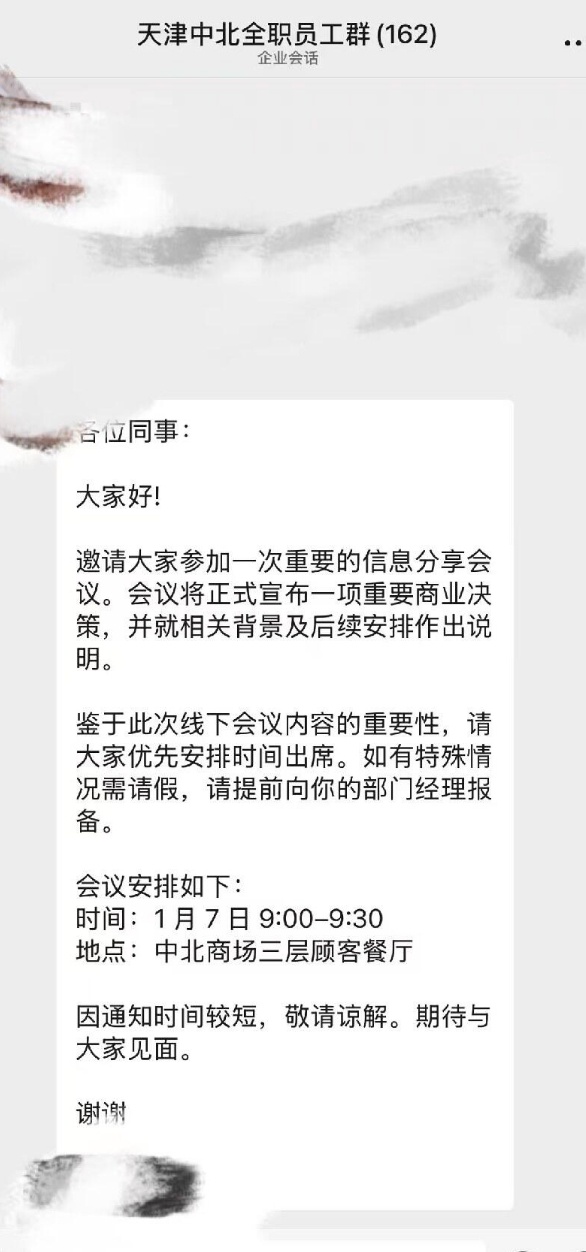 转折点出现在1月7日上午。一张流出的“天津中北全职员工群”内部截图显示,商场避理层在当日上午9:00至9:30召集全体员工于三层顾客餐厅召开了紧急会议,议题为“宣布一项重要商业决策及其后续安排”。