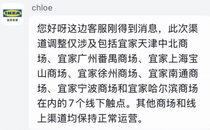 当日中午11时左右,新黄河记者再次致电宜家客服,客服正式确认了7家门店的闭店信息,并回复称这是基于“商业决策”。