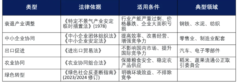 公正交易委员会 (JFTC) 可通过事前申报+审查批准程序,对符合公共利益的行业协同行为给予临时豁免,核心条件包括:
