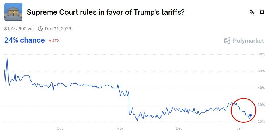 预测平台显示,押注者认为法院支持川普关税的概率约为24%,而立即退还关税收入的概率仅为40%左右。