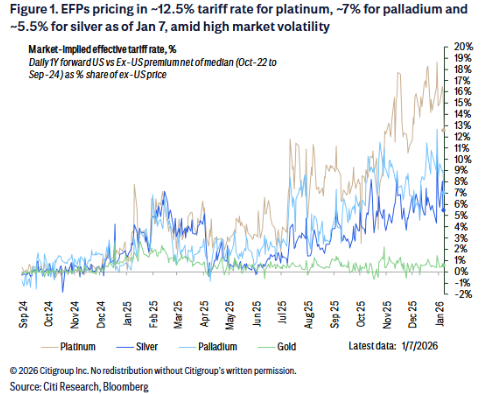 据花旗Kenny Hu的研究团队分析,钯金最有可能面临高额关税(如50%),这将导致美国市场价格飙升,形成相对于伦敦市场的巨大溢价,并引发短期内的“抢运美国”行为。相比之下,白银大概率将被豁免关税。若不征收关税,金属将从美国流出以缓解伦敦市场的现货紧张,可能导致银价面临修正。
