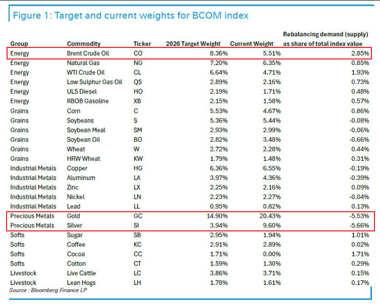 更为紧迫的压力来自资金面。彭博大宗商品指数(BCOM)的年度再平衡已于1月8日盘后开启。由于白银权重将被大幅下调,TD Securities和Deutsche Bank预计,未来两周内将有约77亿美元的白银卖盘涌入市场,这相当于COMEX白银未平仓合约总量的13%。